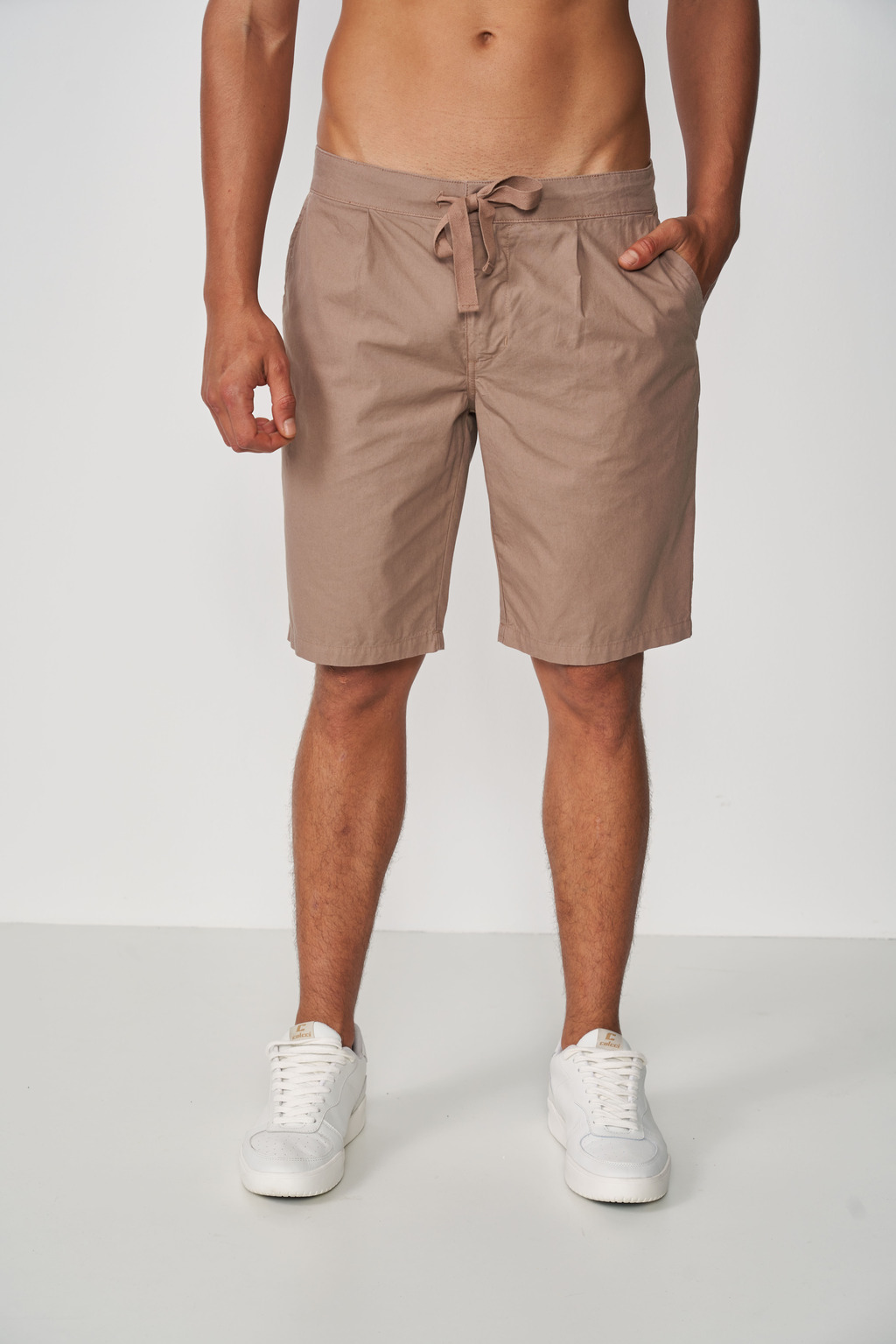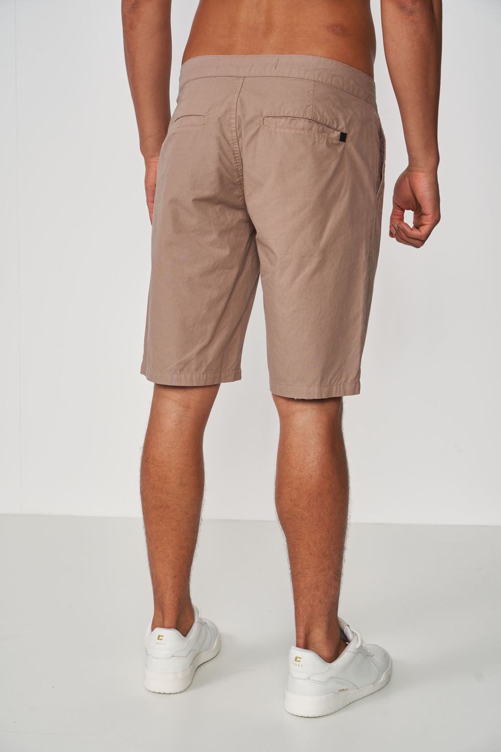Bermuda: Cintura com elástico e cordão, bolsos frontais e traseiros, modelagem reta, comprimento acima dos joelhos.