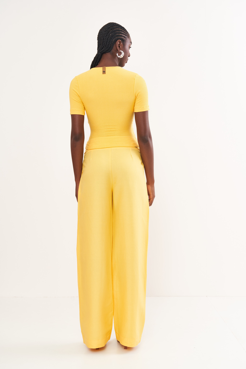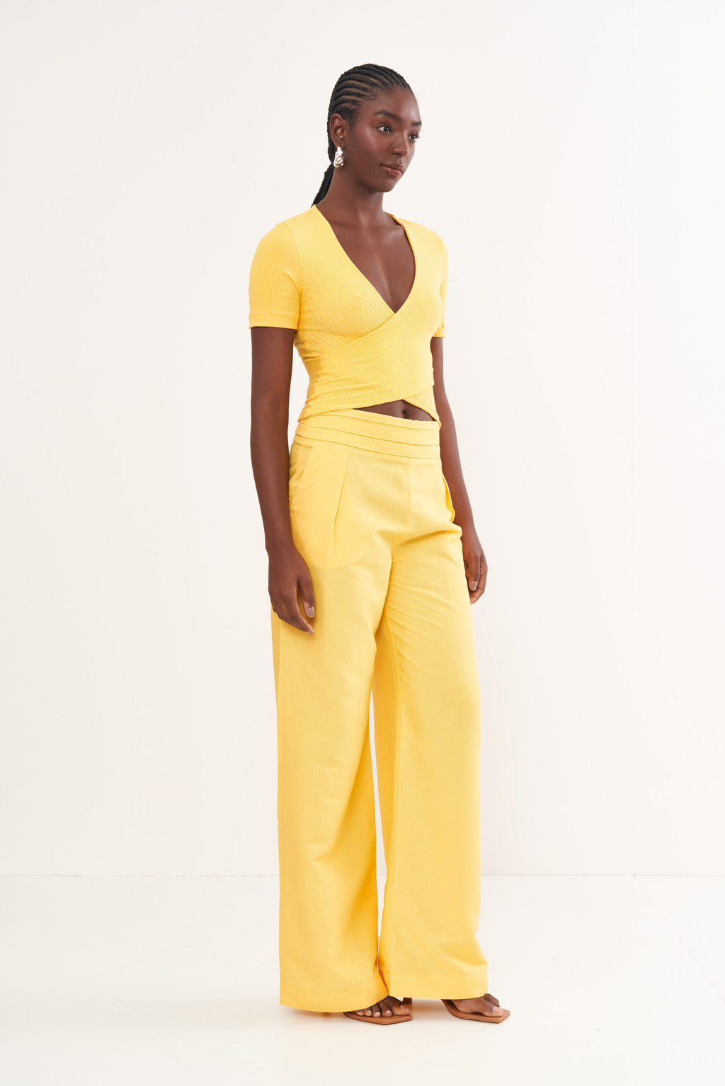 Design: Modelagem cropped e justa com mangas curtas e um elegante decote em V, formado pelo transpasse frontal. As faixas longas para amarração marcam a cintura e permitem diferentes finalizações.