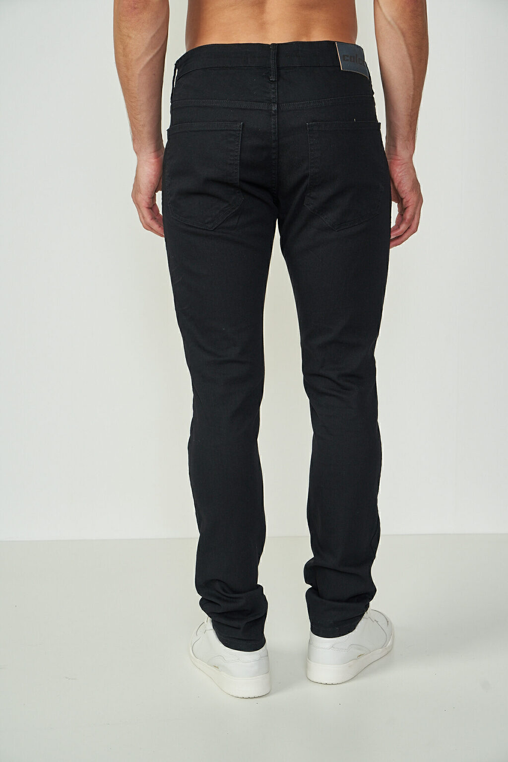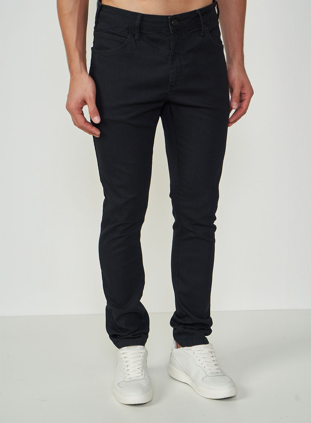 Calça Jeans: Modelagem slim, cós tradicional, cor preta.