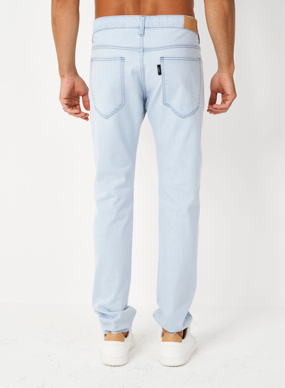 Calça jeans apresenta base Felipe de shape skinny em modelagem com quadril levemente solto e barra ajustada. A peça possui cós com passantes, abertura frontal com fecho de zíper e botão, bolsos dianteiros, traseiros e bolso relógio.