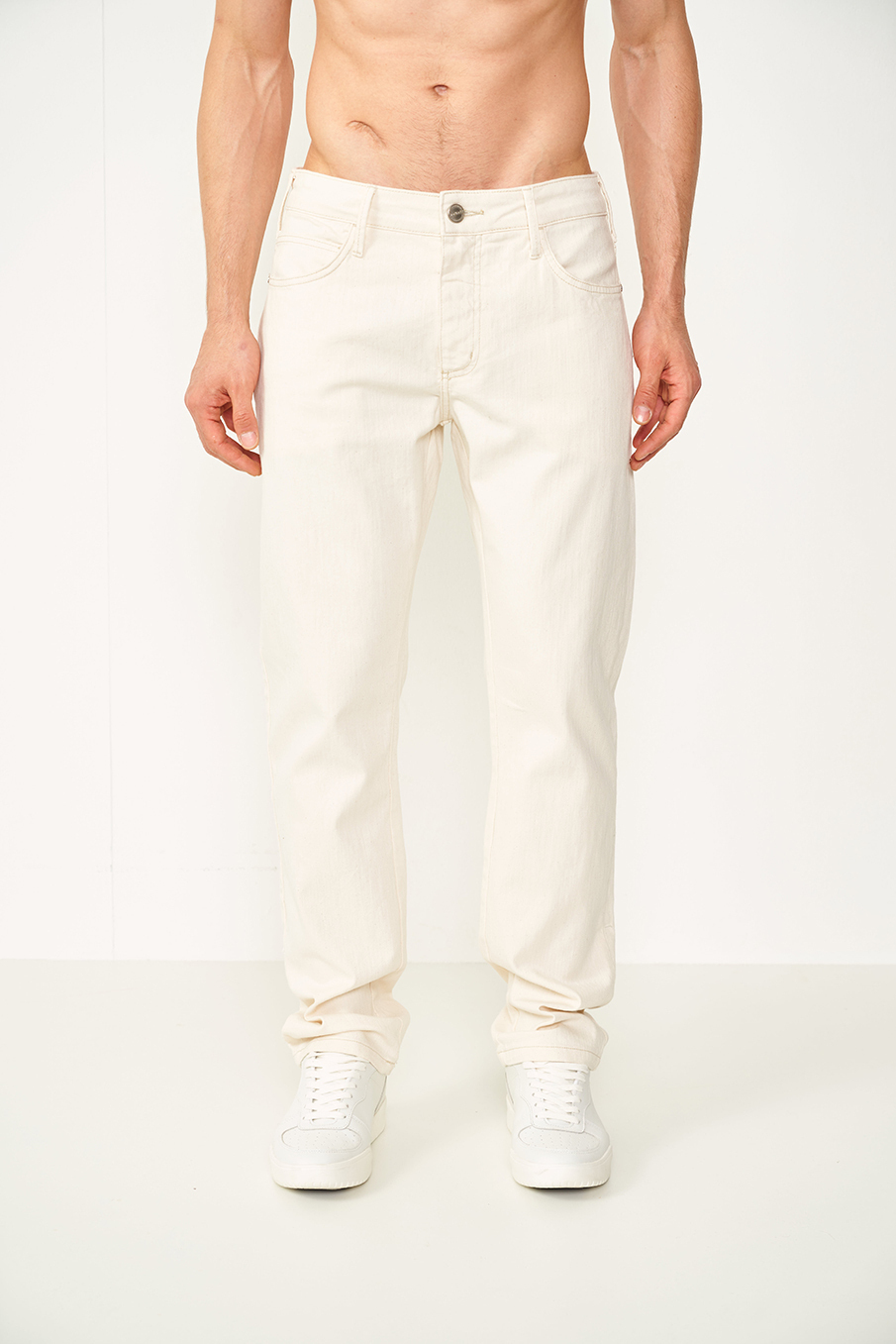 Calça jeans apresenta corte reto. A peça possui cós com passantes, fechamento com zíper e botão, bolsos frontais, bolso relógio, bolsos traseiros e barra com acabamento simples.