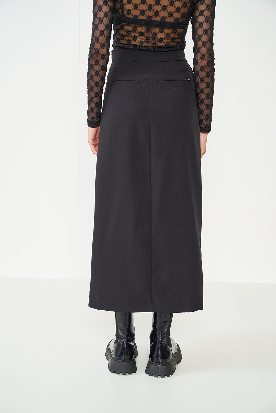 Essa saia é uma peça que esbanja estilo. A saia apresenta shape reto e uma modelagem joana. A peça possui cintura alta, zíper semi invisível na lateral esquerda, detalhe plissado na frente, fenda com transpasse lado direito sobre esquerdo e bolsos embutidos falsos.