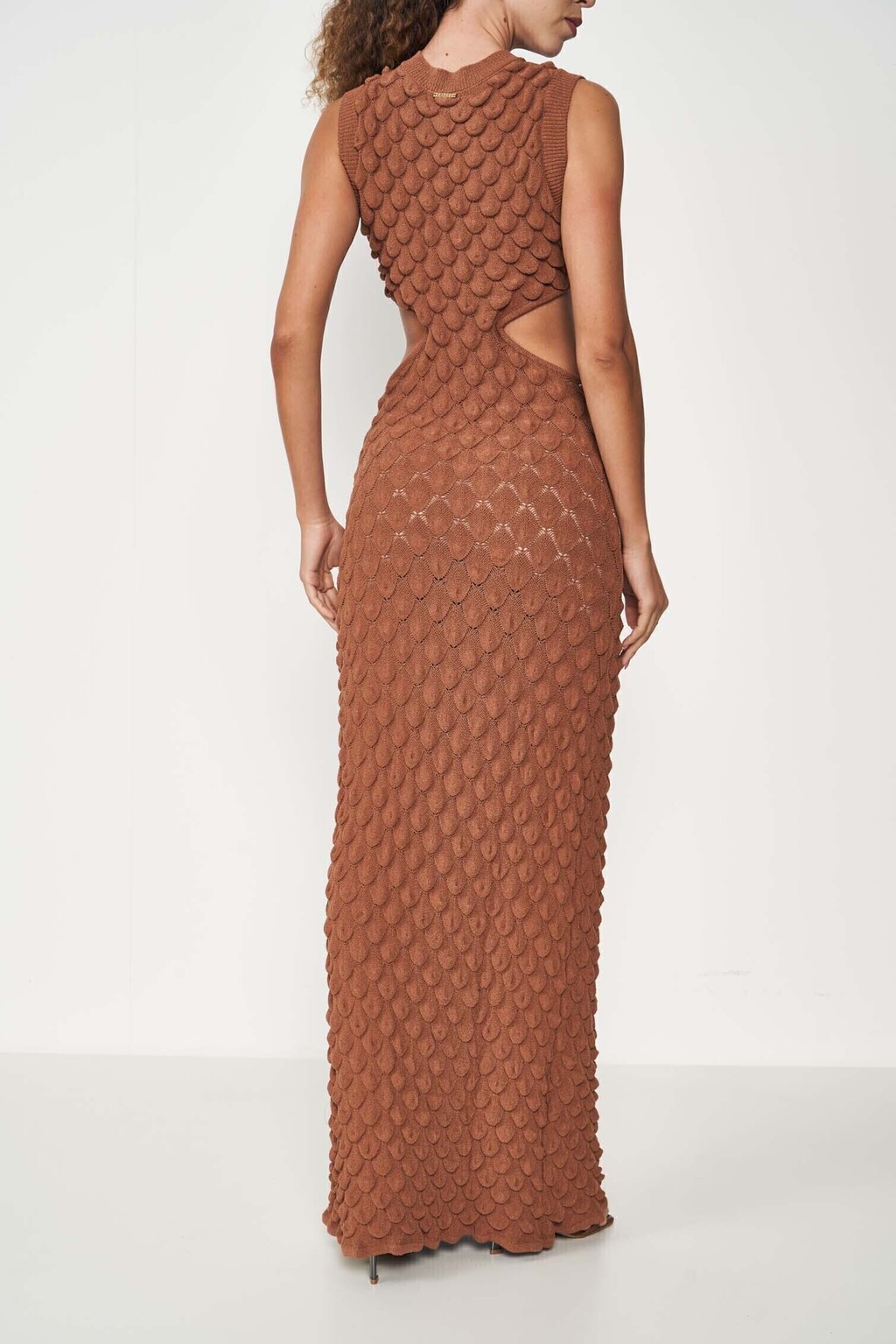Detalhes: Recortes laterais que valorizam a silhueta, textura única em relevo, caimento ajustado ao corpo.